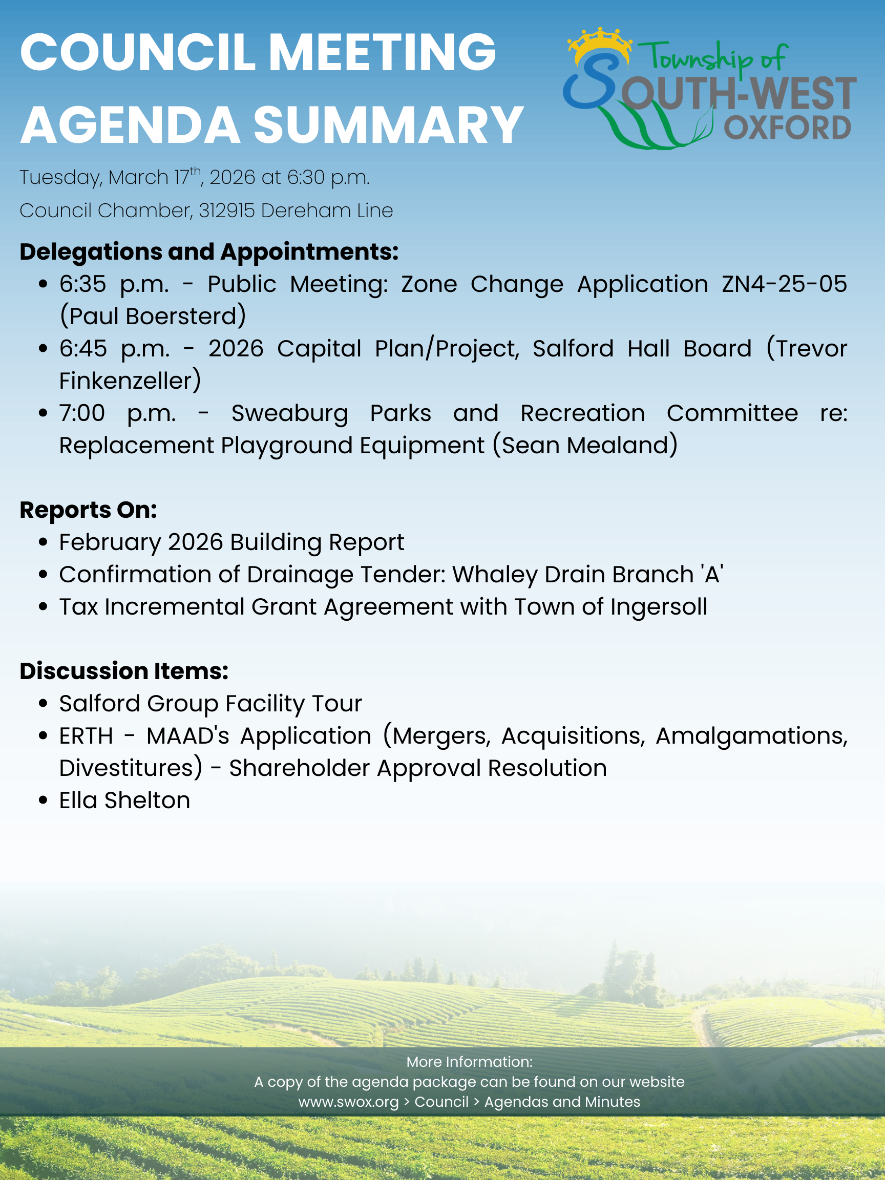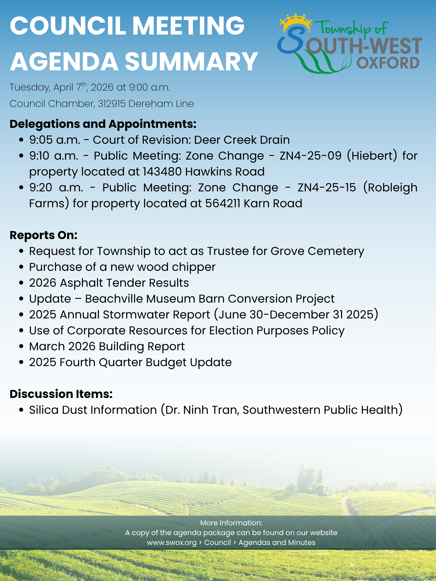 Correspondence to Council can be sent to the Township Office, 312915 Dereham Line, Mount Elgin ON, NOJ 1N0 to the attention of the Clerk or e-mailed to: dgiles@swox.org